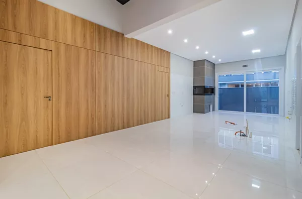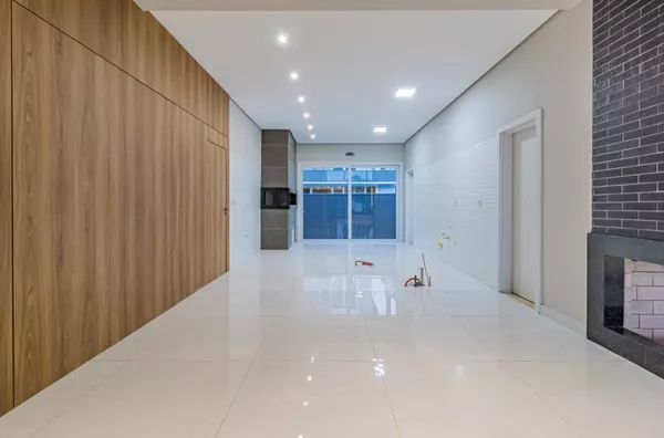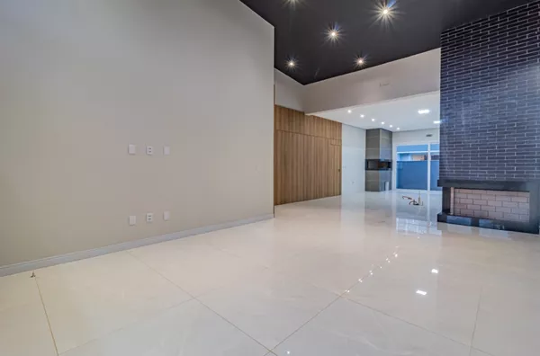 Living em três ambientes com pé direito duplo, lareira, lavabo, lavanderia, garagem para dois veículos lado a lado, 3 suítes.